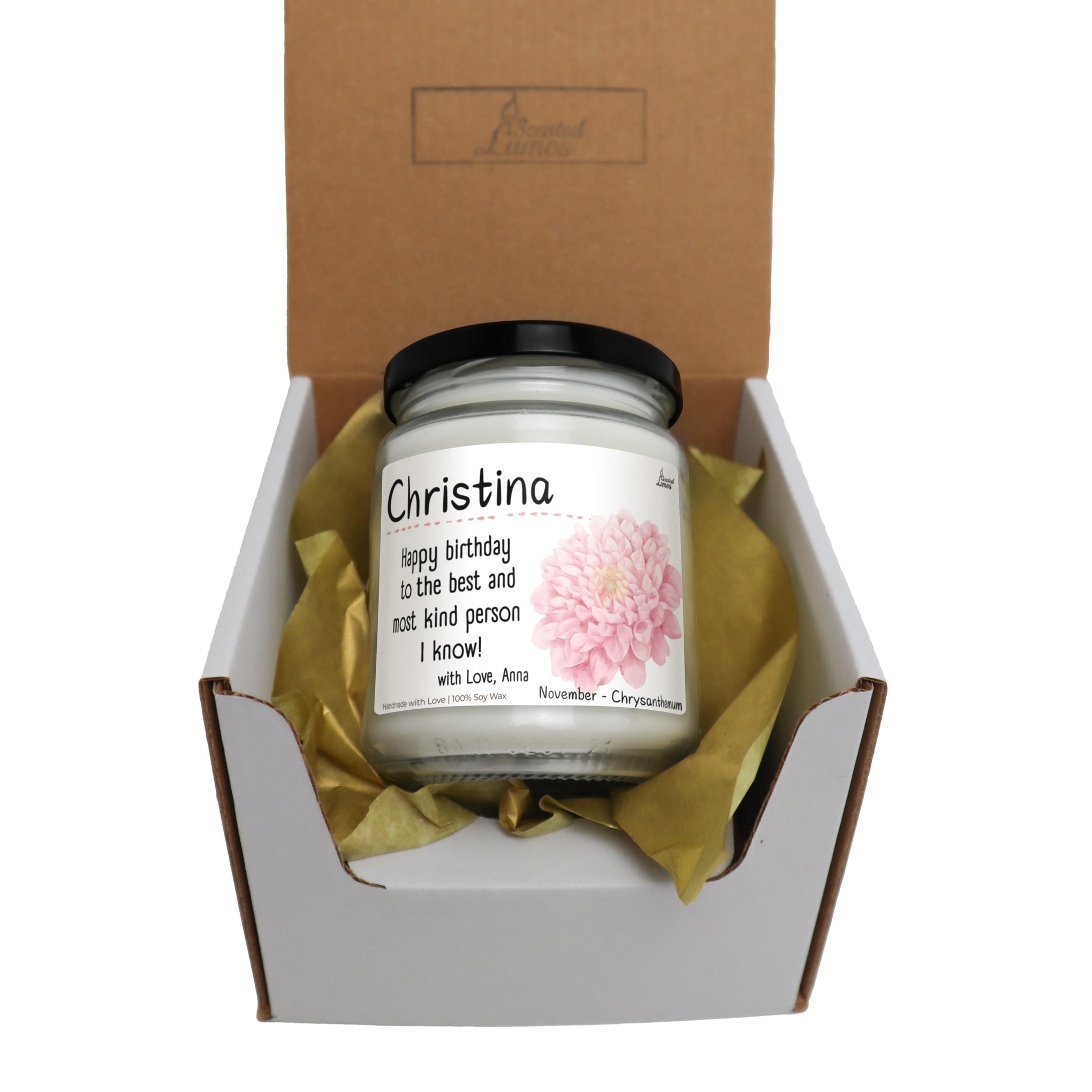 Introducing a unique candle, gift for friends, family, colleagues, with a cool design: Birth month flower for November - Chrysanthemum with a custom Birthday message perfect for celebrating an October birthday.
