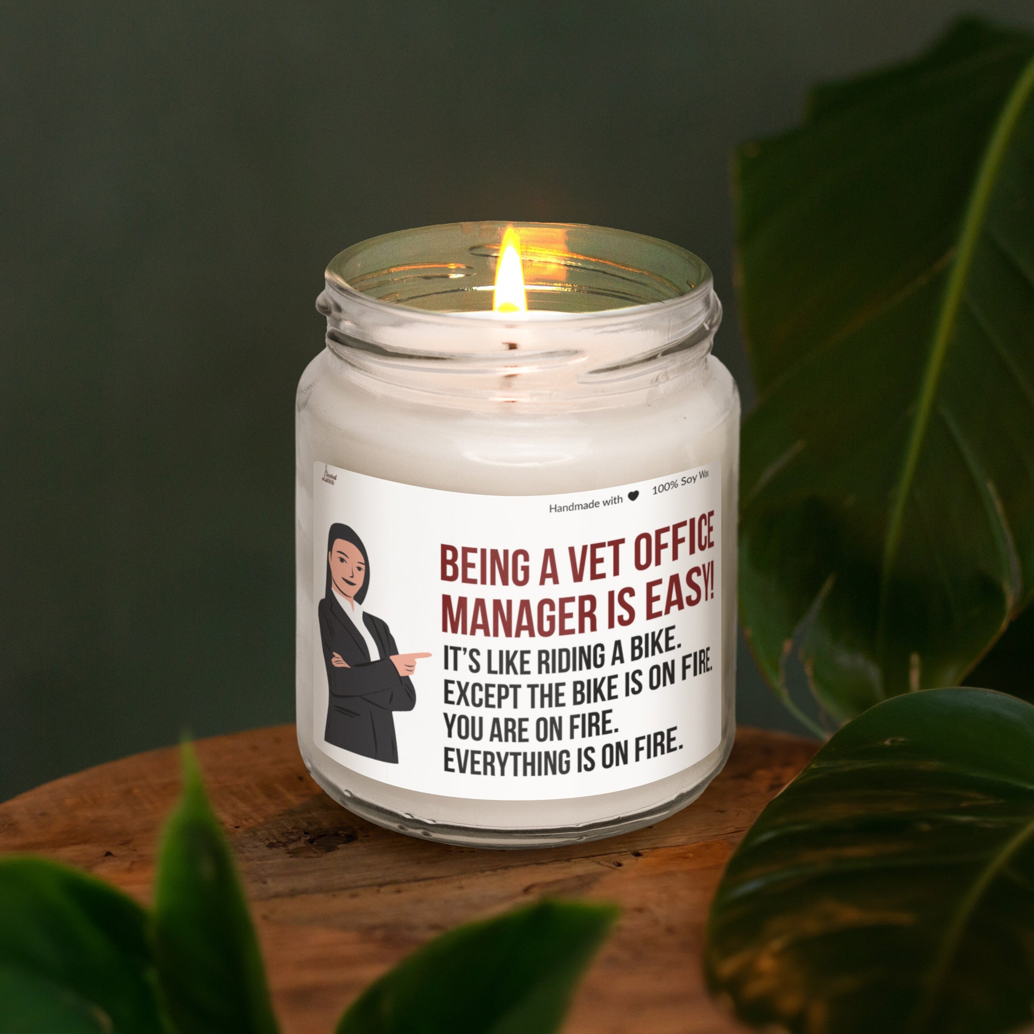 Introducing a unique candle, gift for friends, family, colleagues, with a cool design: Being a vet office manager is easy perfect for celebrating a Vet office manager for their Birthday, Christmas, Mother's Day, World Veterinary Day or any other special day.