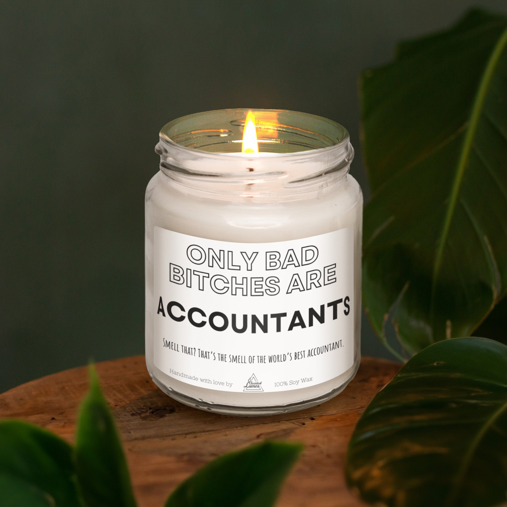 Introducing a unique candle, gift for friends, family, colleagues, with a cool design: Only bad bitches are Accountants perfect for celebrating ан Accountant for their Birthday, Christmas, Mother's Day, International Accounting Day or any other special day.