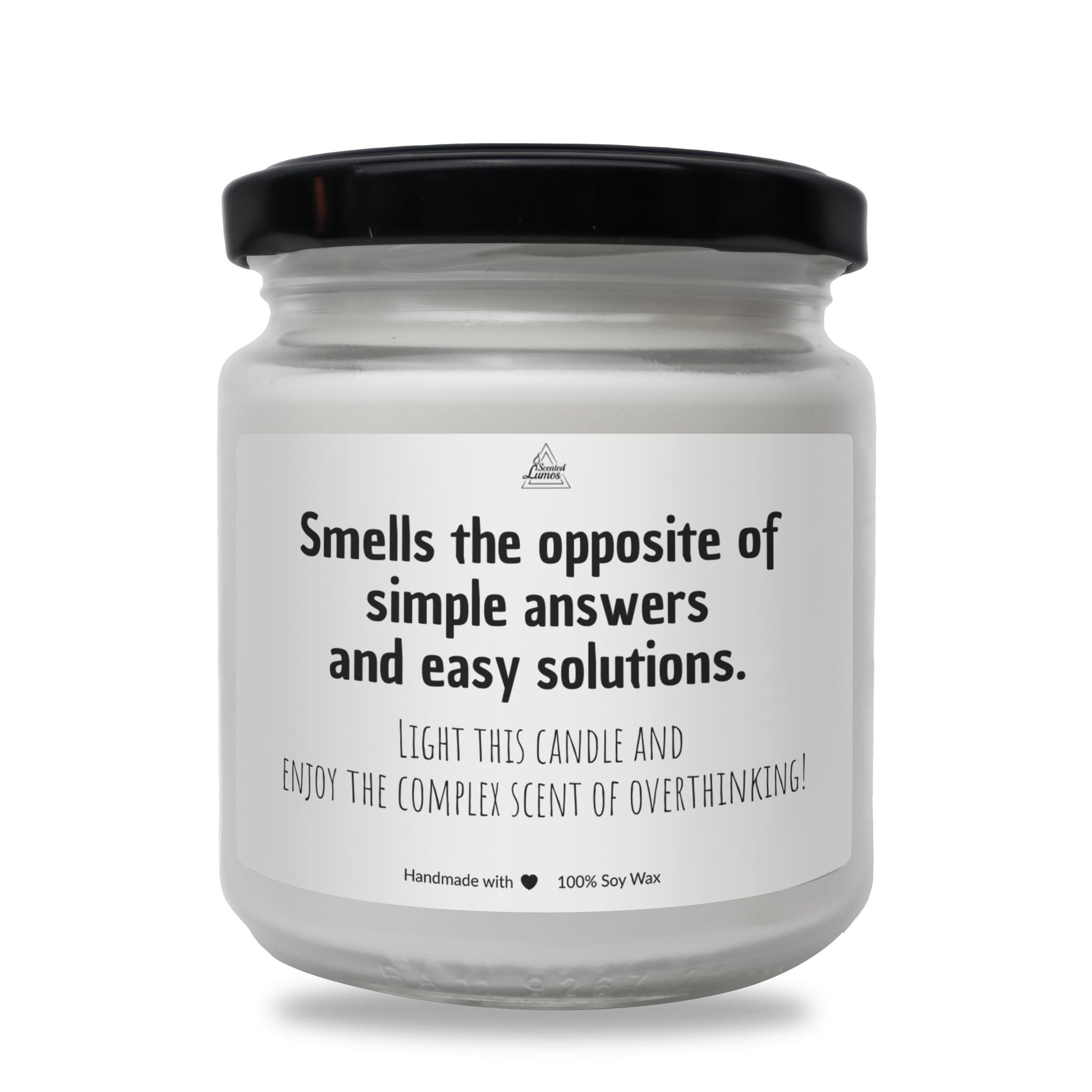 Introducing a unique candle, gift for friends, family, colleagues, with a cool design: Smells the opposite of simple answers and easy solutions. perfect for celebrating a Philosopher, Philosopher teacher for their Birthday, Christmas, Mother's Day, Father's Day, World Philosophy Day or any other special day.