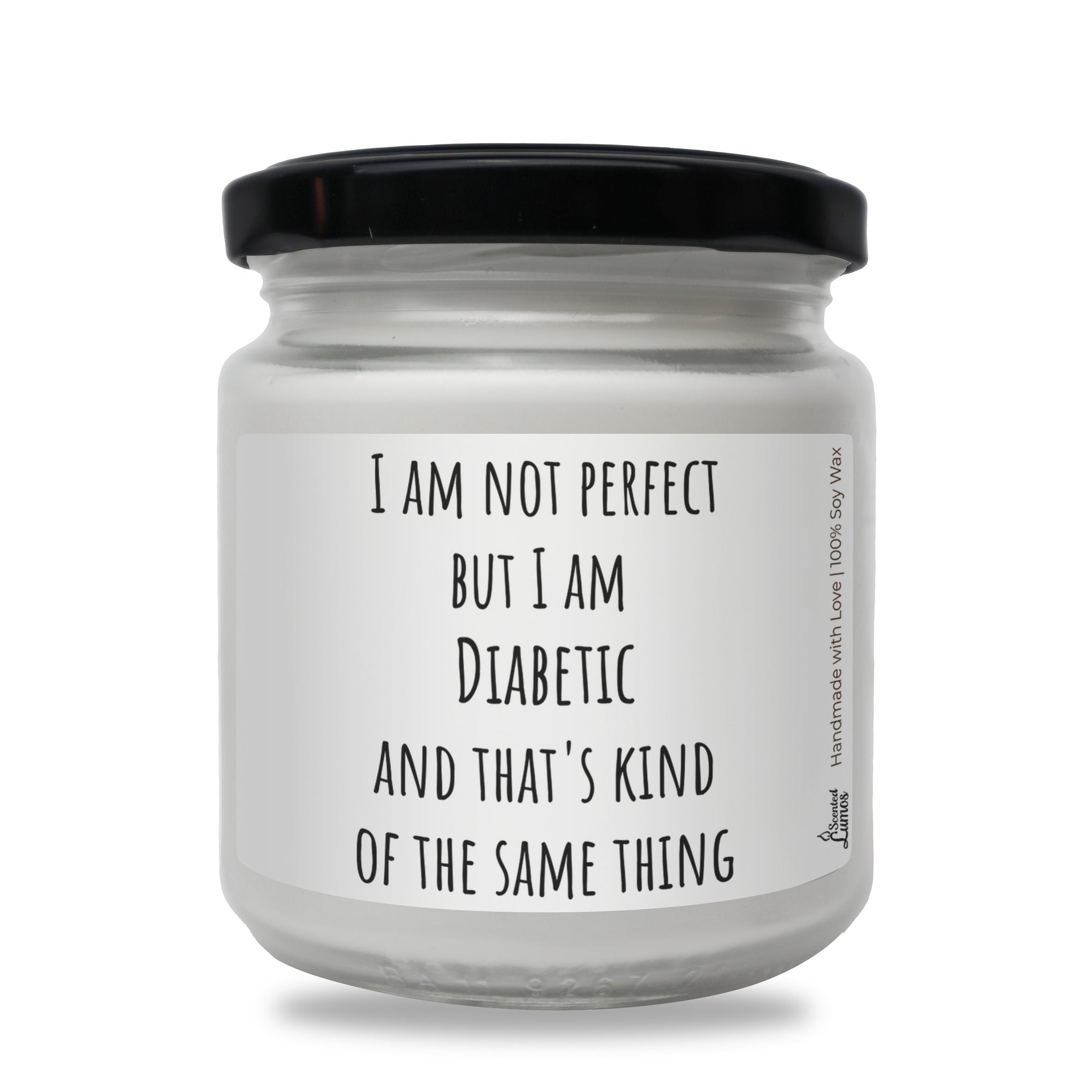 Introducing a unique candle, gift for friends, family, colleagues, with a cool design: I am not perfect but I am Diabetic perfect for celebrating a Diabetic for their Birthday, Christmas, Mother's Day, Father's Day, Diabetes Awareness Month, World Diabetes Day or any other special day.