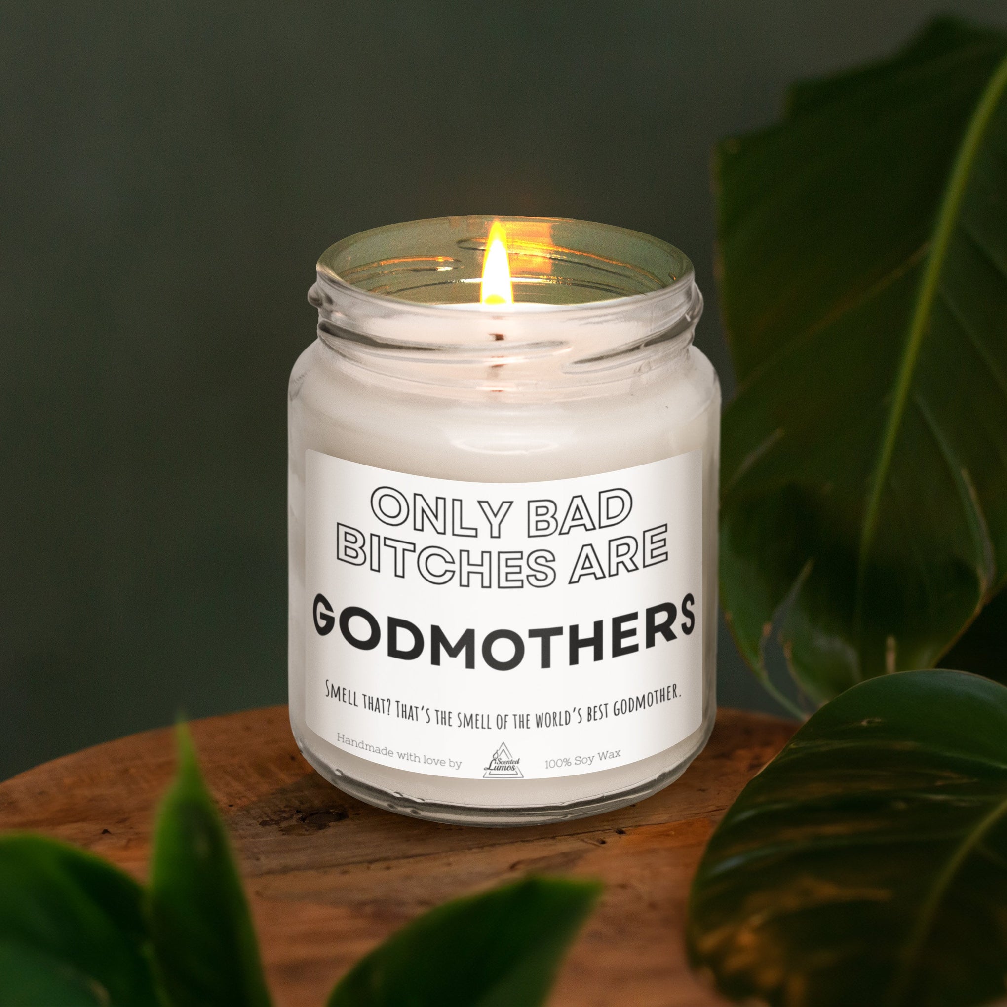Introducing a unique candle, gift for friends, family, colleagues, with a cool design: Only bad bitches are Godmothers perfect for inviting or celebrating a Godmother for their Birthday, Christmas, Mother's Day or any other special day.